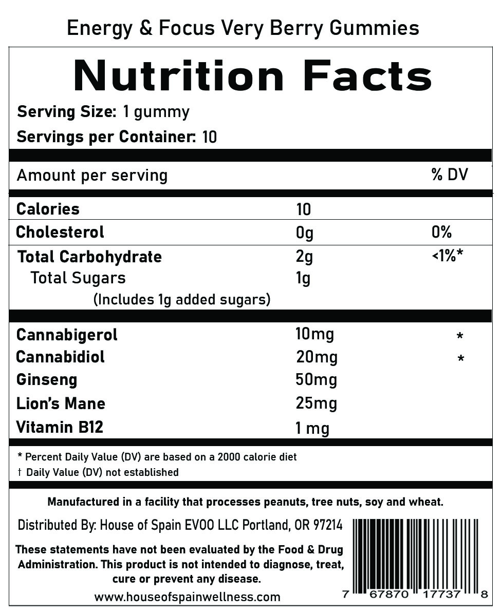 Ingredients: Water, Corn Syrup, Pectin, Citric Acid, Sodium Citrate, Natural Flavors, Potassium Sorbate (preservative), American Ginseng (Panax Quinquefolius), Dry Root Extract, Lions Mane Extract (Hericium erinaceus), Hemp Extract, Vitamin B12 (Cyanocobalamin), Natural Color (Beetroot)